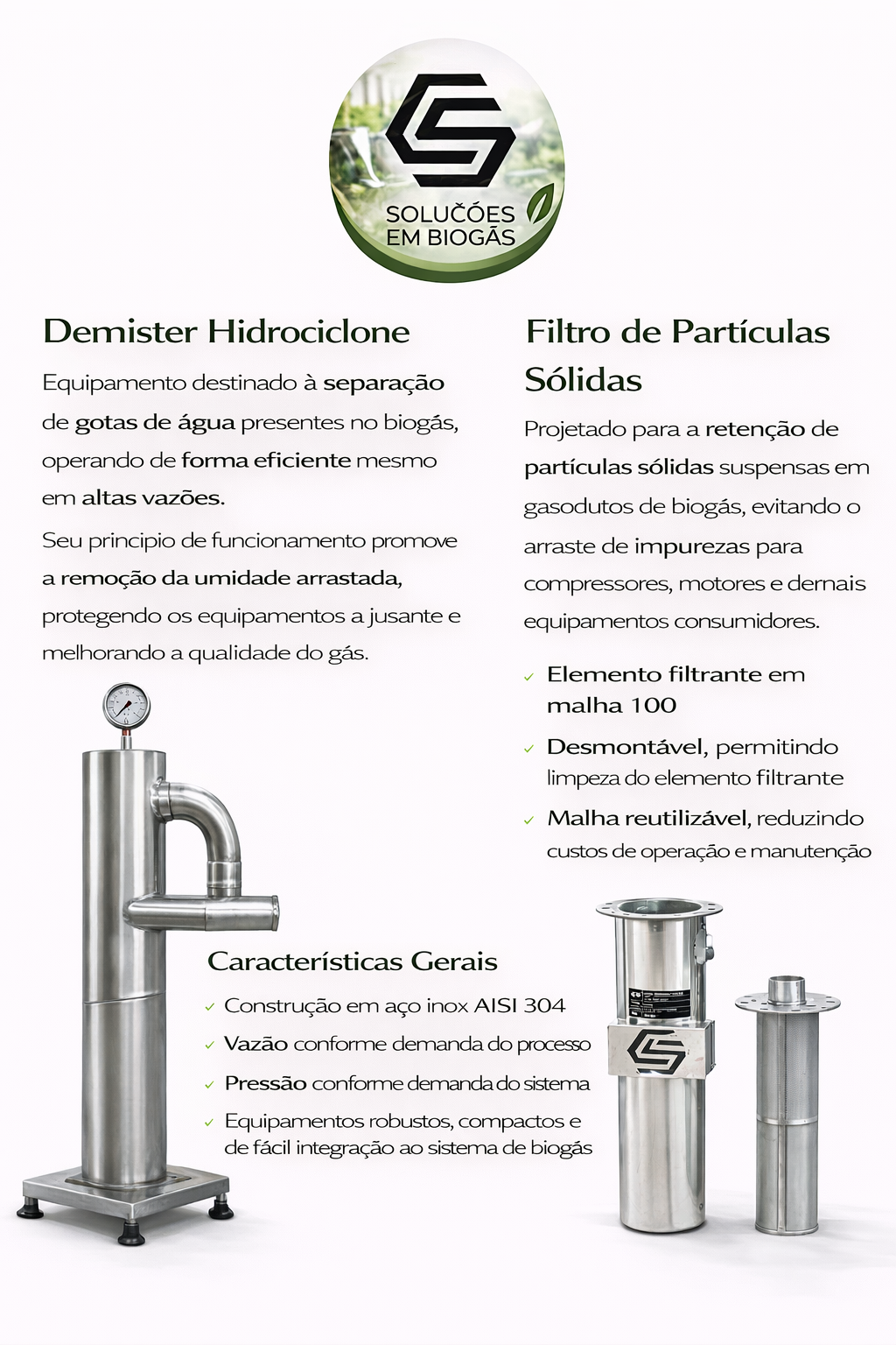 Equipamentos desenvolvidos para tratamento físico do biogás, garantindo remoção de umidade e partículas sólidas, proteção dos sistemas a jusante e aumento da vida útil de motores, compressores e demais equipamentos consumidores.